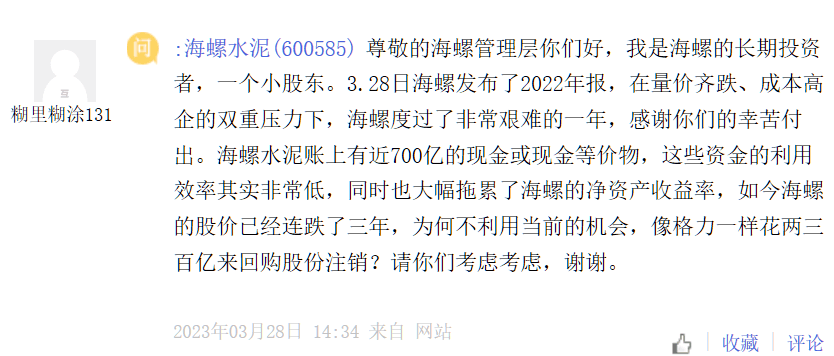 另有一位海螺的长期投资者表示:海螺水泥2022年在量价齐跌、成本高企的双重压力下,海螺度过了非常艰难的一年,感谢你们的辛苦付出。海螺水泥账上有近700亿的现金或现金等价物,这些资金的利用效率其实非常低,同时也大幅拖累了海螺的净资产收益率,如今海螺的股价已经连跌了三年,为何不利用当前的机会,像格力一样花两三百亿来回购股份注销?