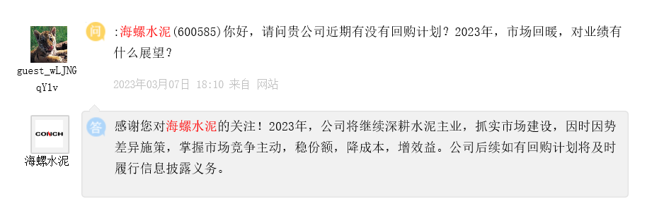 海螺水泥回复称,2023年,公司将继续深耕水泥主业,抓实市场建设,因时因势差异施策,掌握市场竞争主动,稳份额,降成本,增效益。