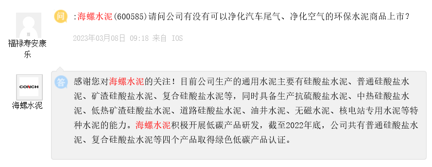 海螺水泥回复:目前公司生产的通用水泥主要有硅酸盐水泥、普通硅酸盐水泥、矿渣硅酸盐水泥、复合硅酸盐水泥等,同时具备生产抗硫酸盐水泥、中热硅酸盐水泥、低热矿渣硅酸盐水泥、道路硅酸盐水泥、油井水泥、无磁水泥、核电站专用水泥等特种水泥的能力。海螺水泥积极开展低碳产品研发,截至2022年底,公司共有普通硅酸盐水泥、复合硅酸盐水泥等四个产品取得绿色低碳产品认证。