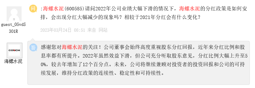 海螺水泥回复称,“十四五”期间,公司将坚定主业发展信心不动摇,做强做优水泥主业及上下游产业链,推动环保、新能源、数字产业协调发展,以绿色低碳可持续发展为目标,加大在减污降碳、节能降耗上的研发和投入。公司董事会一直以来高度重视股东分红回报,近年来分红比例和股息率都有所提升。2022年虽然效益下滑,但公司充分听取股东意见,分红比例大幅上升至50%,较去年增加了12个百分点。