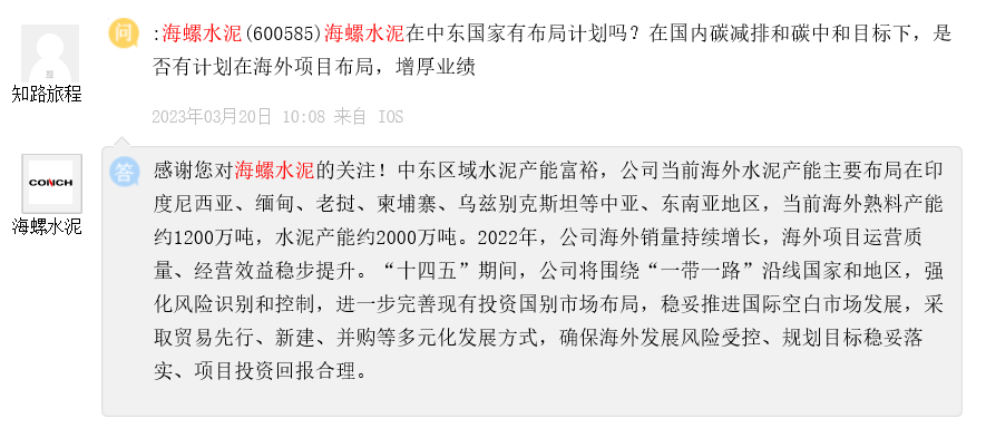 问题七:海螺水泥在中东国家有布局计划吗?在国内碳减排和碳中和目标下,是否有计划在海外项目布局,增厚业绩?