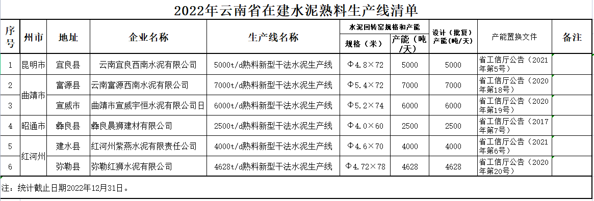 其中包括2022年10月投产的安徽池州海螺水泥股份有限公司10000t/d熟料生产线、2022年8月投产的合肥南方水泥有限公司6000t/d熟料生产线以及2021年12月投产的马鞍山铁鹏水泥有限公司4000t/d。