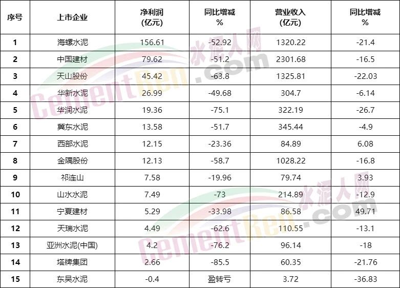 2022年上市水泥企业净利润和营收情况一览