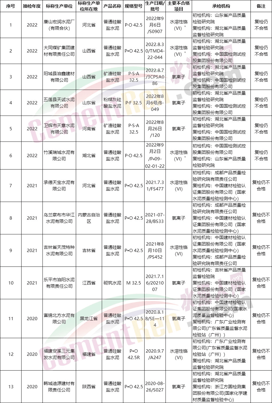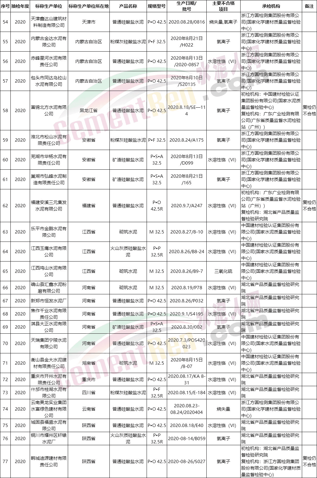2020~2022年国抽水泥产品不合格名单发布,共77批次不合格