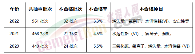 水泥人网注意到,2022年不合格产品较上年增加了11个批次,而且近三年国抽不合格项目中均包含氯离子、水溶性铬(Ⅵ)。2020年~2022年国抽不合格名单中有13家企业复检仍不合格。其中2022年国抽复检仍不合格的企业共6个批次,2021年4个批次,2020年3个批次。