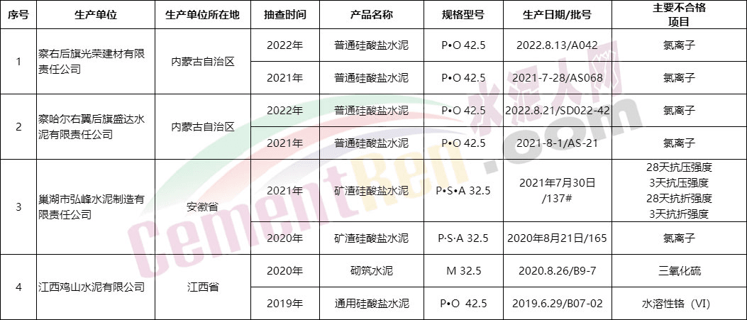 另有4家企业有连续两年抽检不合格的现象。不合格项目涉及氯离子、抗压强度、抗折强度、三氧化硫、水溶性铬(VI)等。