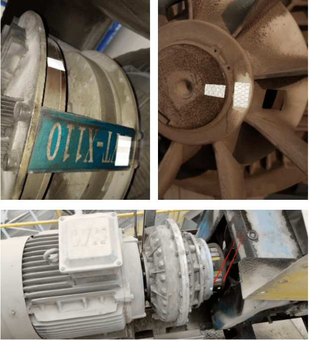 1.设备停机时对各设备联轴方式进行检查、清理,选择合适位置粘贴反光贴纸。因现场粉尘较大,为防止粘贴不牢固原因导致设备运行后反光贴纸掉落影响检测,部分位置选择多处检测点粘贴并进行标记。