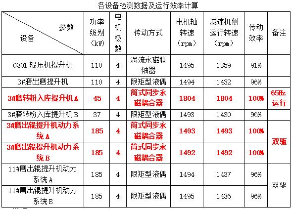 2、测量时间为水泥生产淡季,工况为间歇式运行,载荷较低,甚至部分工况部分时间为空载运行,实际载荷对液偶运行转速影响较明显,故测得目前液偶输出转速均较高,满料运行后液偶输出转速将会有所降低,传动效率将处于95%左右。