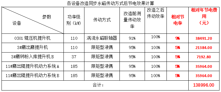 使用同步永磁耦合器针对液偶、涡流永磁工况进行改造,可明显提升设备运行效率,降低损耗,从而达到节能的效果,数据计算结果如下表所示: