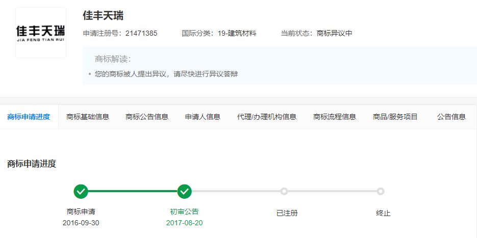 水泥人网注意到,上述水泥包装袋上标称的“佳丰天瑞”商标申请并未通过。