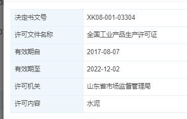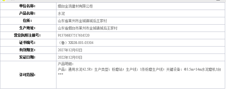 企业新申请的生产许可证编号为(鲁)XK08-001-03304 ,有效期至2022年12月2日。许可范围为1条粉磨生产线,关键设备为Φ3.5m×14m水泥磨机1台。