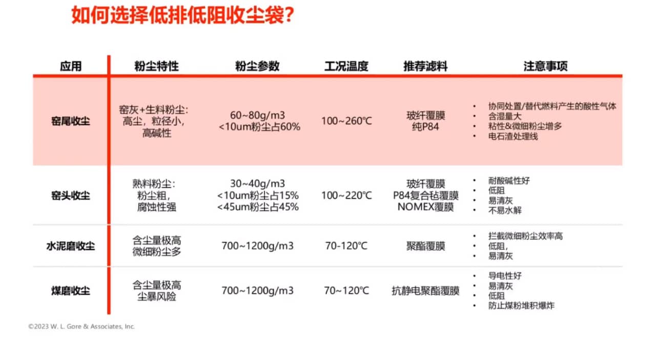 选择低排低阻收尘滤袋首先需要考虑工艺点粉尘的特性,含尘量,粉尘粒径,工况温度(极限温度和持续工作温度)。再根据工艺特点有针对性地选择,如是否有协同处置?是否使用替代燃料,是否添加钢渣,电石渣、化工废渣等?以判断粉尘中的油气、黏性是否会引起烟气的酸碱度、湿度的变化。另外,窑头、窑尾、水泥磨、煤磨各点位因粉尘的特性的不同对上述参数的要求各有不同。