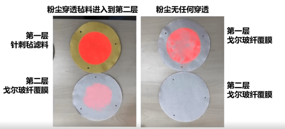 用两层面料做测试,如果第一层性能好的话,第二层上就看不到粉尘的泄漏。从对比效果可见,两层都采用戈尔玻纤覆膜滤料,第一层滤料拦截粉尘之后,光滑表示不容易挂灰,起到了有效清灰的效果。