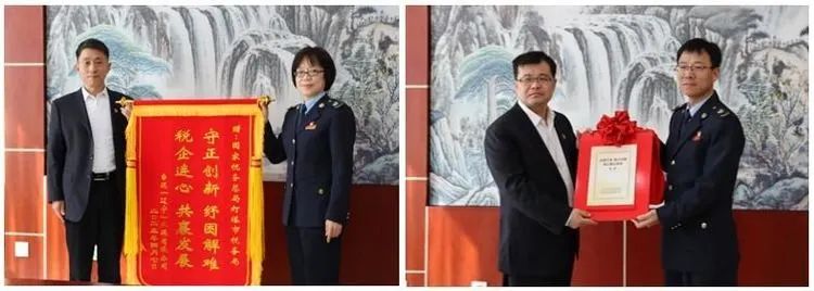 金隅冀东水泥辽宁区域党委书记闫海峰向灯塔市税务局赠送锦旗,灯塔市税务局副局长张毅向台泥(辽宁)水泥有限公司赠送税收宣传资料。