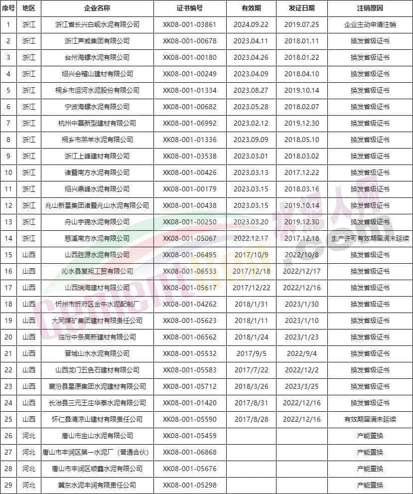 据查询,近期浙江、河南、山西三省市场监管部门发布了注销水泥企业生产许可通告,近30家企业生产许可证被注销。