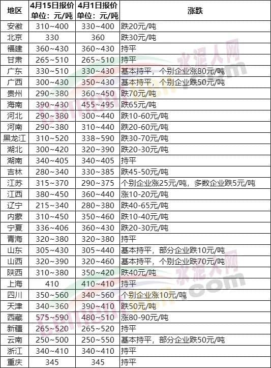 涨价发通知,跌价不通知。一片跌跌不休中,水泥价格越来越不透明,各企业对外报价核心市场、外埠市场、新开发市场各有不同。针对商砼客户、经销商、建材店又有不同优惠促销政策,南方雨季到来,4月中下旬水泥价格大概率仍维持目前下行趋势。