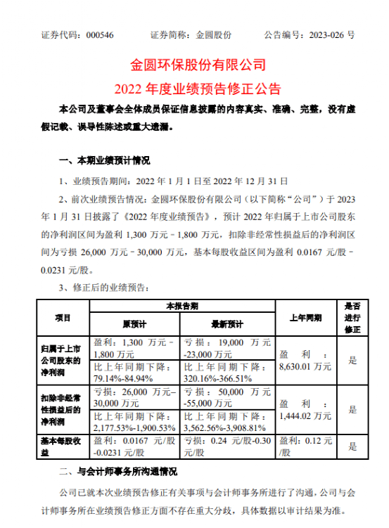 2023年4月16日晚间,金圆股份业绩爆雷,预计2022年业绩由盈利转为亏损,预计亏损1.9亿元至2.3亿元,同比下降320.16%至366.51%。扣非后亏损5亿至5.5亿元,同比下降3562.56%至3908.81%。