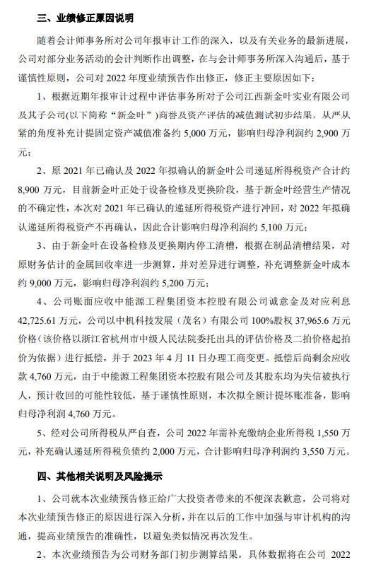 金圆股份还提到公司账面应收中能源工程集团资本控股有限公司诚意金及对应利息42725.61万元,公司以中机科技发展(茂名)有限公司100%股权37965.6万元价格进行抵偿,并于2023年4月11日办理工商变更。抵偿后尚剩余应收款4760万元,由于中能源工程集团资本控股有限公司及其股东均为失信被执行人,预计收回的可能性较低,基于谨慎性原则,本次拟全额计提坏账准备,影响归母净利润4760万元。