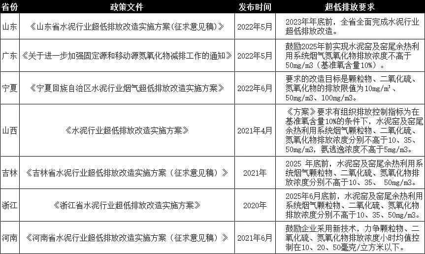 为了响应国家政策,国内不少省份如广东、山东、浙江、宁夏、山西等已经根据自身实际制定并收紧了水泥行业超低排放标准。具体情况如下: