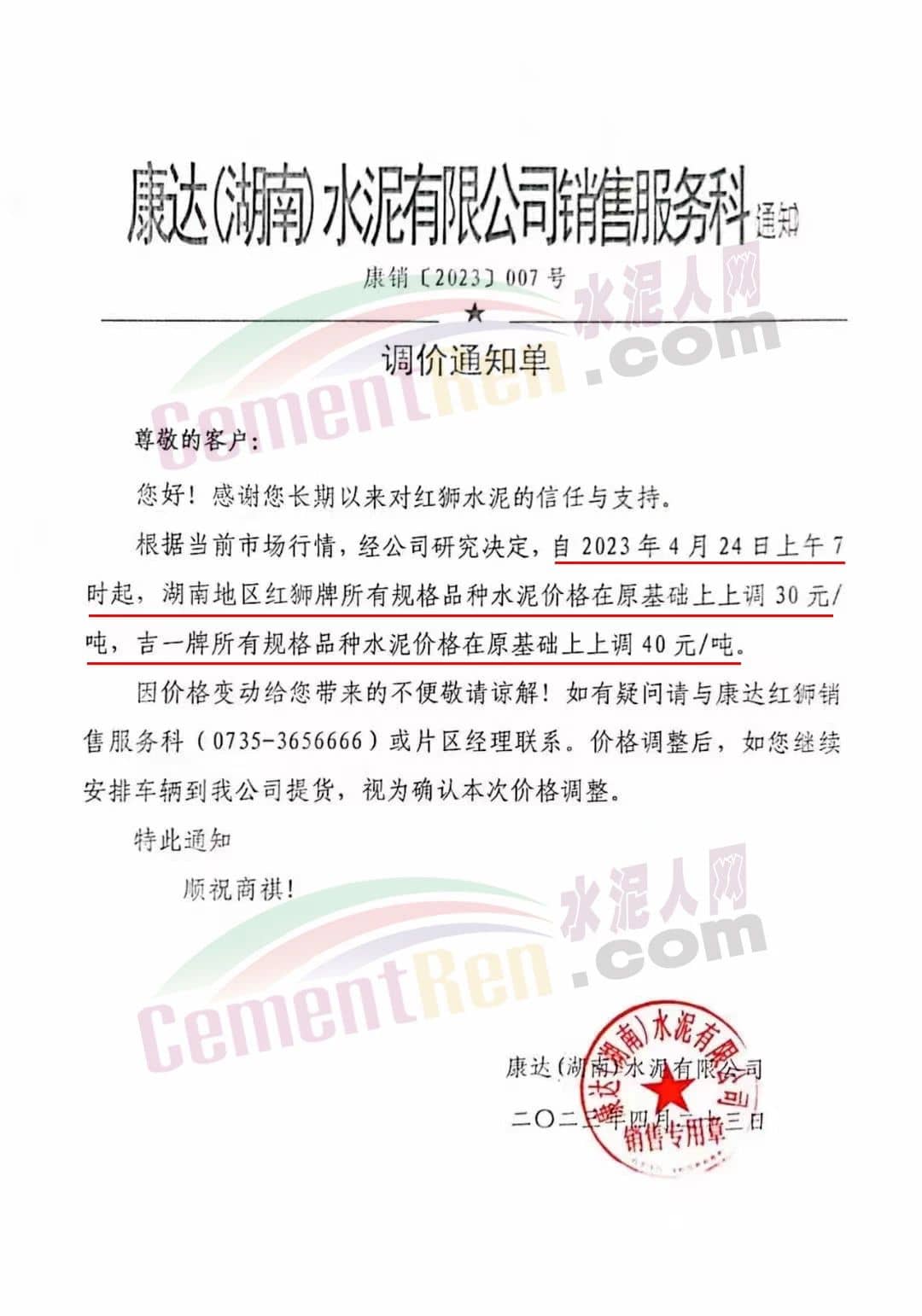 与上述区域类似,湖南区域红狮水泥旗下康达湖水泥有限公司销售服务科通知称,根据当前市场行情,经公司研究决定,自2023年4月24日上午7时起,湖南地区红狮牌所有规格品种水泥价格在原基础上上调30元/吨,吉一牌所有规格品种水泥价格在原基础上上调40元/吨。