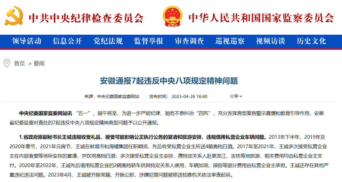 昨日(4月26日),安徽省纪委监委通报了7起违反中央八项规定精神问题,其中对安徽省政府原副秘书长、海螺水泥原董事长王诚违规违法问题进行了通报。