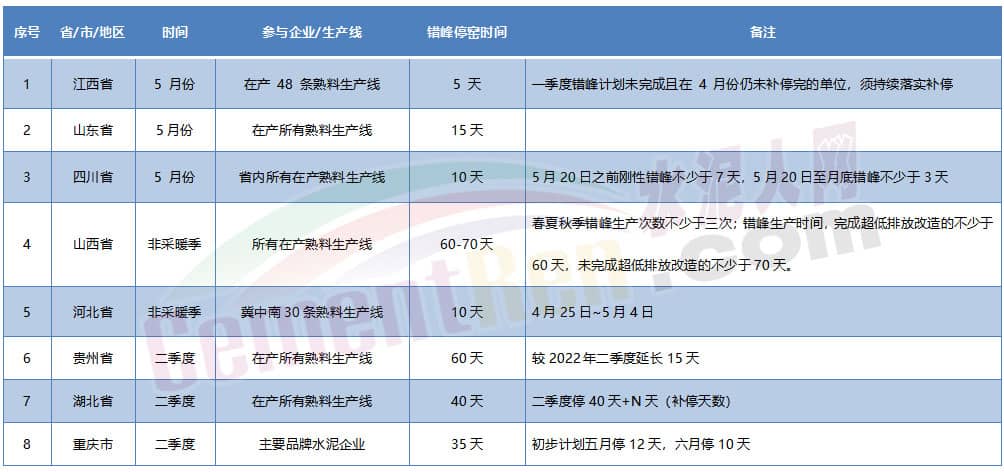 湖南省水泥协会《关于2023年二季度增加5天错峰停窑的通知》要求一、二季度在原有35天基础上增加5天错峰停窑时间,其中一季度未停窑到位的单位在二季度补停到位,即二季度停40天+N天(补停天数)。