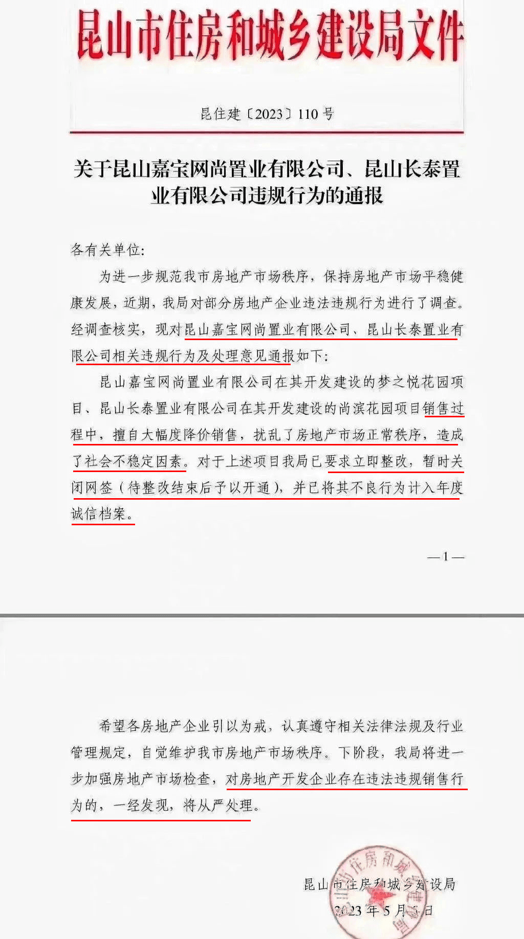 日前,江苏苏州昆山住建局在微信群发布一则通报文件,两家房企因在售房过程中,擅自大幅度降价销售,扰乱了房地产市场正常秩序被处罚。