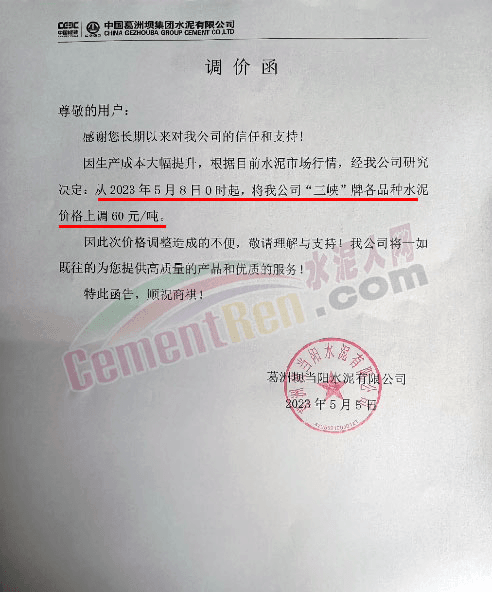 据了解,自年初以来水泥市场波动频繁,部分区域水泥价格已然触底。5月5日葛洲坝当阳水泥有限公司通知称,因生产成本大幅提升,根据目前水泥市场行情,经公司研究决定从2023年5月8日0时起,将公司“三峡”牌各品种水泥价格上调60元/吨。