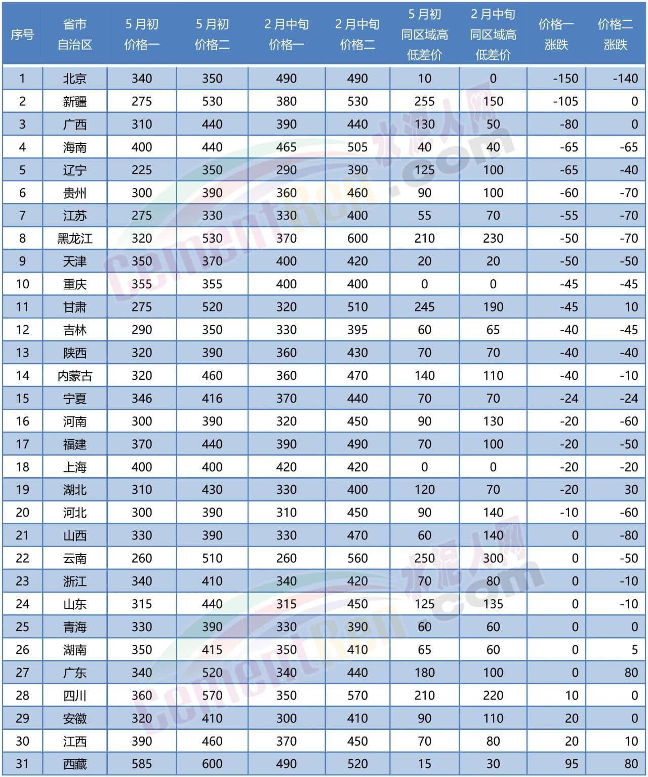 相对较高价中北京、山西、贵州、江苏、黑龙江、海南、河南、河北、天津、福建、云南、重庆、吉林、辽宁、陕西、宁夏、上海、内蒙古、浙江、山东20个区域环比2月中旬报价下跌10-140元/吨;新疆、广西、青海、四川、安徽5个地区环比2月中旬持平;湖南、甘肃、江西、湖北、广东、西藏6个地区环比2月中旬回升5-80元/吨。