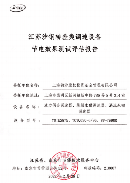 另外,上海锦沙股权投资基金管理有限公司委托江苏省、南京市节能技术服务中心对江苏沙钢转差类调速设备节电效果进行了测试评估,评估的设备有:液力偶合调速器、绕组永磁调速器、涡流永磁调速器。江苏省、南京市节能技术服务中心于2022年1月19日~20日在沙钢对其电炉炼钢二车间精炼除尘风机、新布袋除尘风机及炼铁厂东区高炉车间2#矿槽除尘风机配备的三台转差类调速设备进行对比评估测试,评估测试各风机在额定转速及调速模式下的耗电情况,了解各台转差类调速设备在运行现场的节电效果。并于2022年2月28日出具了评估报告。