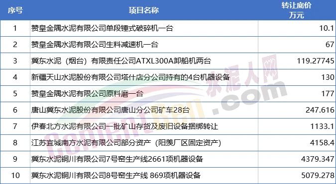 10个正在转让的项目多为固定资产和设备机器转让。其中冀东水泥铜川有限公司8号窑生产线869项机器设备转让底价超5000万元。