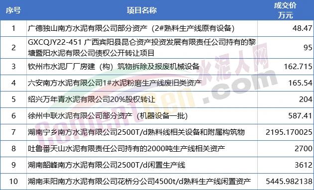 10个已成交项目中,除广西宾阳县昆仑资产投资发展有限责任公司持有的黎塘暨阳水泥有限公司债权公开转让及绍兴万年青水泥有限公司20%股权转让外,其他均为机器设备或生产线闲置资产。且主要为中国建材集团旗下南方水泥、天山水泥、中联水泥等企业闲置资产。
