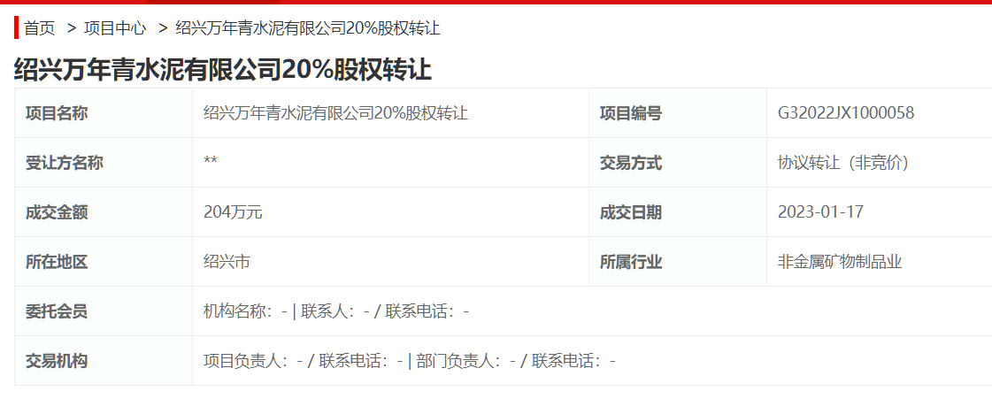 水泥人网注意到绍兴万年青水泥有限公司20%股权转让项目是以协议转让(非竞价)方式成交,成交金额204万。
