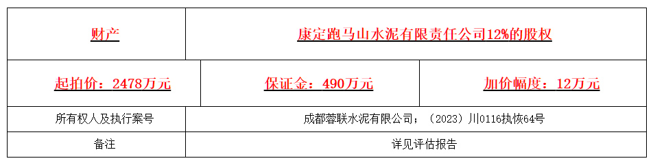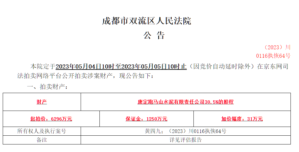 3月29日,成都市双流区人民法院发布拍卖公告(川0116执恢64号)提到定于5月4日10时至5月5日10时在京东网司法拍卖网络平台公开拍卖涉案财产。拍卖财产为康定跑马山水泥有限责任公司12%的股权,起拍价2478万元。