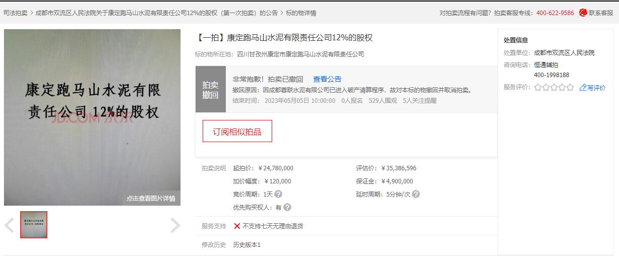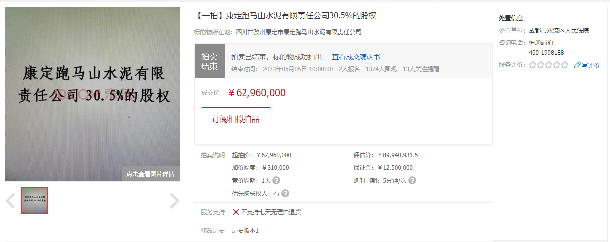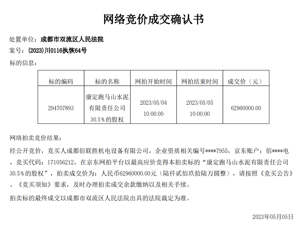 同期,康定跑马山水泥有限责任公司30.5%的股权于5月5日被成功拍出,并未受到成都蓉联水泥有限公司破产的影响。成交确认书显示,经公开竞价,竞买人成都佰联胜机电设备有限公司在京东网拍平台以最高价竞得本拍卖标的,拍卖成交价为6296万元。