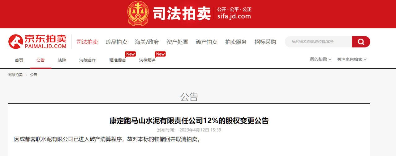 从京东司法拍卖平台可见,成都蓉联水泥有限公司已进入破产清算程序,故对本标的物撤回并取消拍卖。