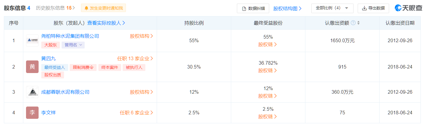 成都蓉联水泥有限公司为何能影响康定跑马山水泥有限责任公司的股权出售呢?从企业股权结构可见,康定跑马山水泥有限责任公司由尧柏特种水泥持股55%,黄四九持股30.5%,成都蓉联水泥有限公司持股12%,李文祥持股2.5%。