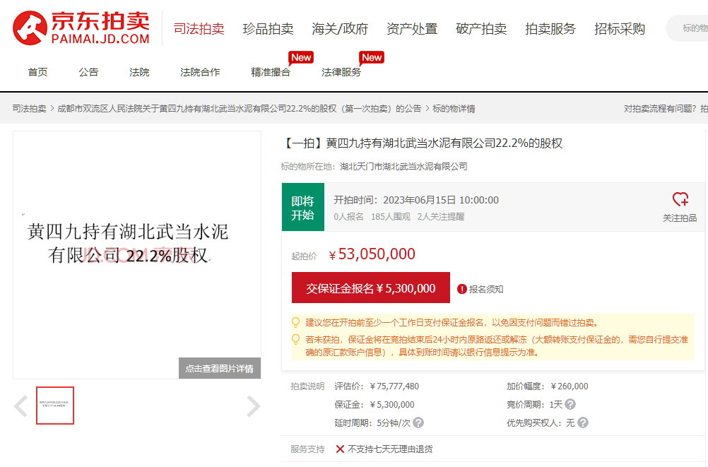 京东资产交易平台另有信息显示,黄四九持有的湖北武当水泥有限公司18%、22.2%的股权也即将拍卖,起拍价分别为4301万元、5305万元。湖北武当水泥有限公司成立于2006年,位于湖北省十堰市郧西县城关镇,该公司拥有一座2500t/d全能工厂。湖北武当水泥有限公司由黄四九持股99%。
