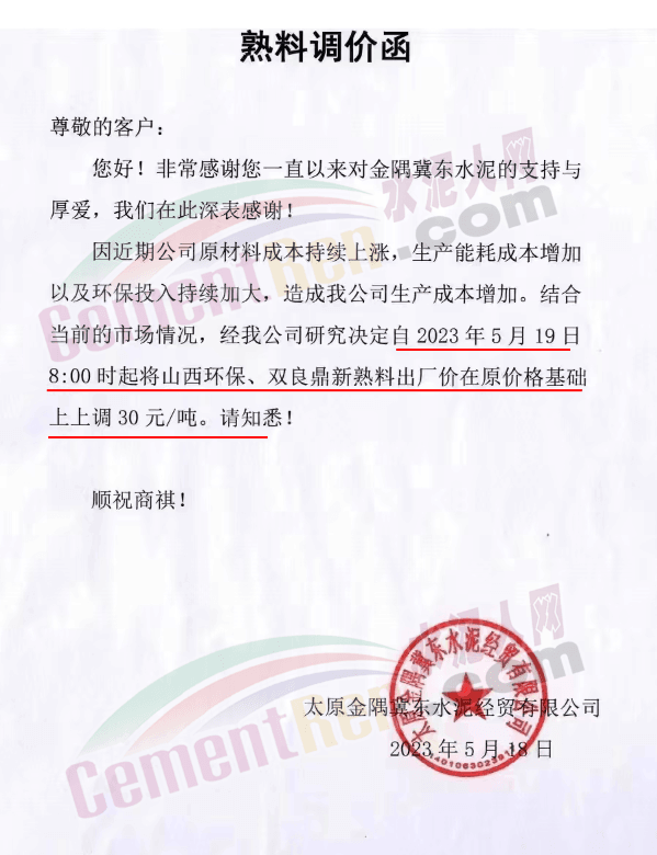 太原金隅冀东水泥经贸有限公司通知,因近期公司原材料成本持续上涨,生产能耗成本增加以及环保投入持续加大,造成公司生产成本增加。结合当前的市场情况,经公司研究决定自5月19日8时起将山西环保、双良鼎新熟料出厂价在原价格基础上上调30元/吨。
