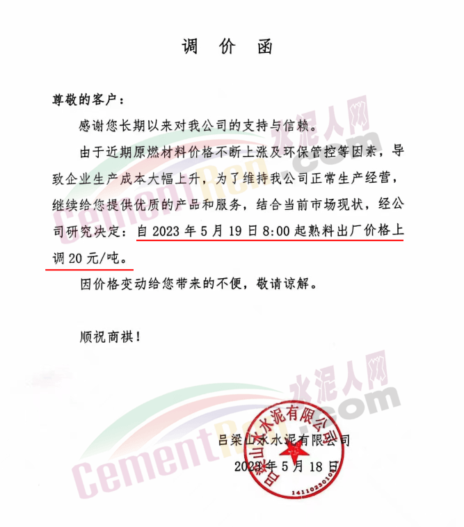 吕梁山水水泥有限公司通知,由于近期原燃材料价格不断上涨及环保管控等因素,导致企业生产成本大幅上升,为了维持公司正常生产经营继续给客户提供优质的产品和服务,结合当前市场现状,经公司研究决定,自5月19日8时起熟料出厂价格上调20元/吨。