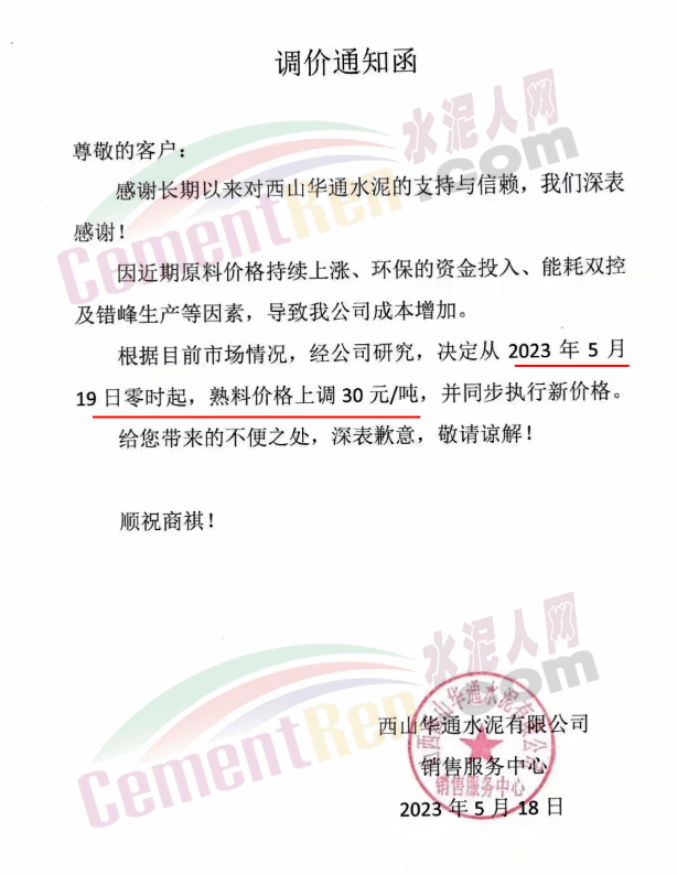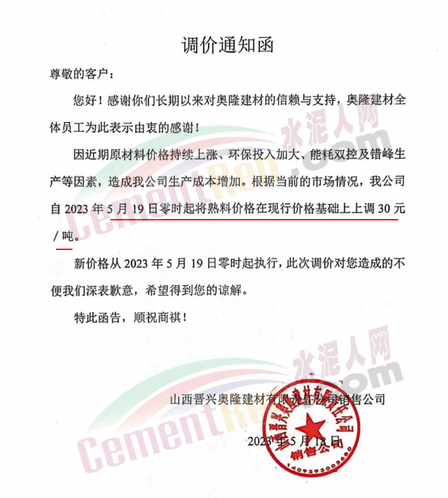 山西晋兴奥隆建材有限责任公司销售公司通知,因近期原材料价格持续上涨、环保投入加大、能耗双控及错峰生产等因素,造成公司生产成本增加。根据当前的市场情况,公司自2023年5月19日零时起将熟料价格在现行价格基础上上调30元/吨。
