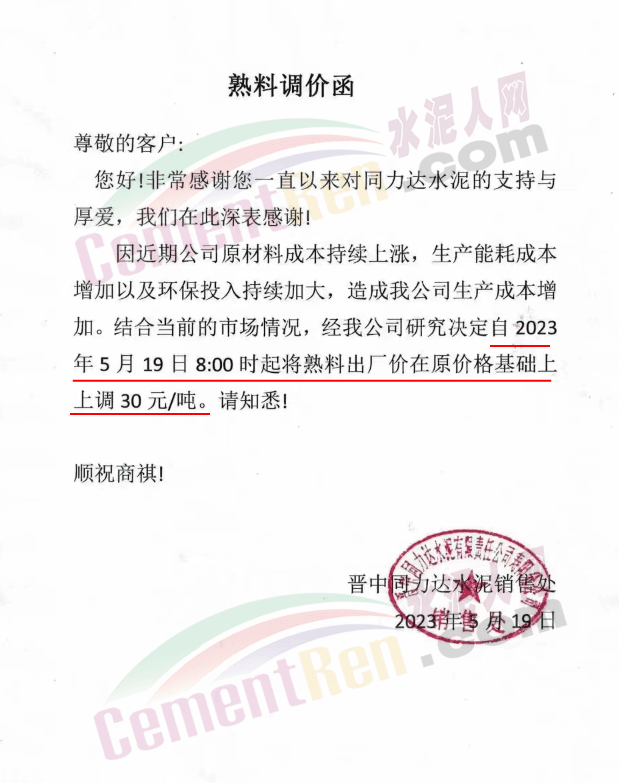 晋中同力达水泥销售处通知,因近期公司原材料成本持续上涨,生产能耗成本增加以及环保投入持续加大,造成公司生产成本增加。结合当前的市场情况,经公司研究决定自5月19日8时起将熟料出厂价在原价格基础上上调30元/吨。
