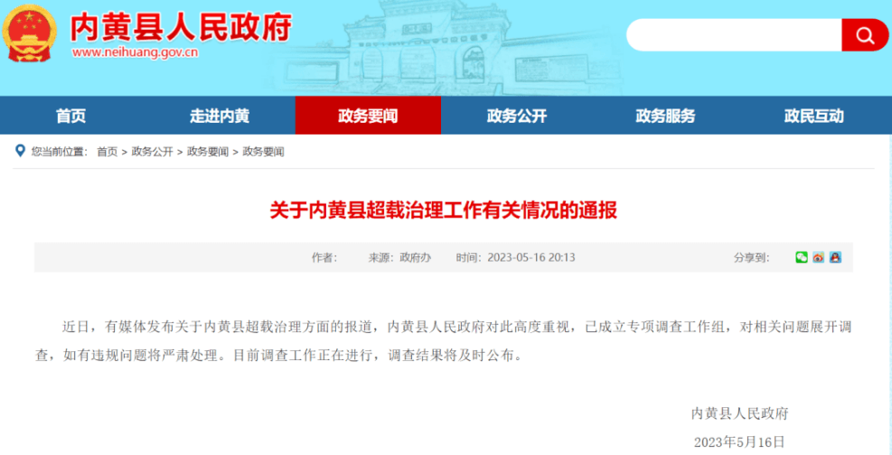 5月18日,内黄县人民政府发布《关于反映内黄县超载治理工作情况的调查通报》。