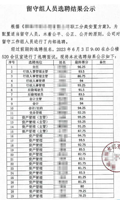 企业发布的《留守组人员选聘结果公示》显示,经过前期的选聘报名、面试共有29人留守。选聘岗位分别为行政人事管理、后勤驾驶员、会计、出纳、党务管理、资产管理等。