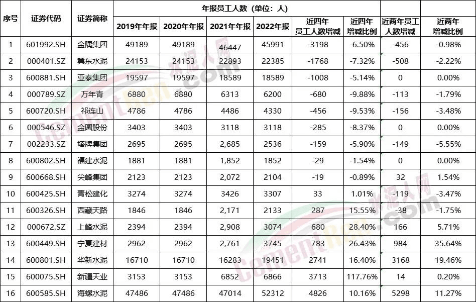2021~2022年金隅集团、冀东水泥、万年青、祁连山、塔牌集团、青松建化等均有百人以上的减员,冀东水泥减员达500多人 。