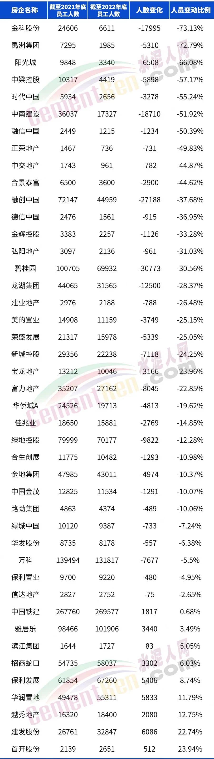 50强房企2022年员工人数及变化
