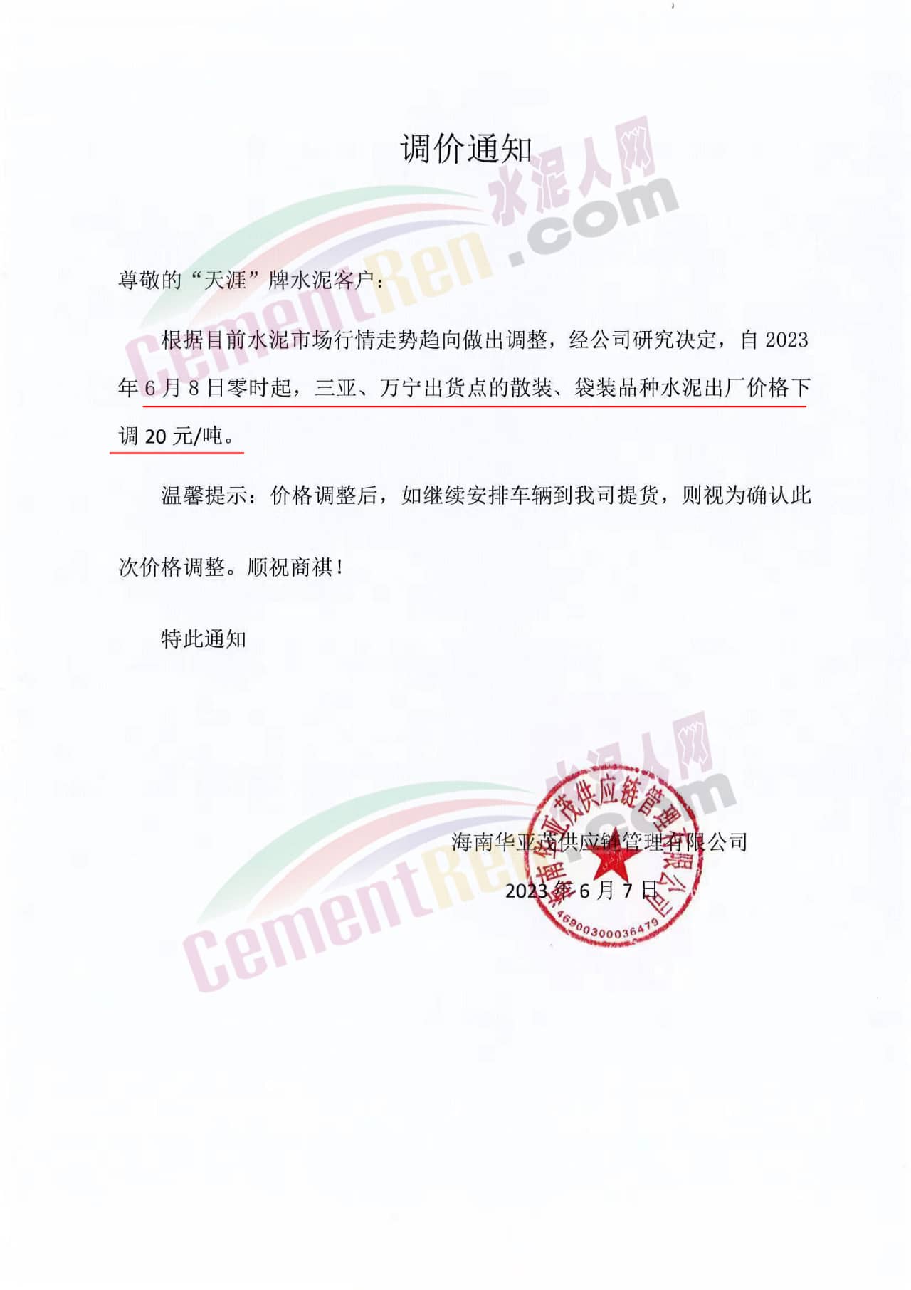 海南华亚茂供应链管理有限公司通知根据目前水泥市场行情走势趋向做出调整。经公司研究决定,自2023年6月8日零时起,三亚、万宁出货点的散装、袋装品种水泥出厂价格下调20元/吨。