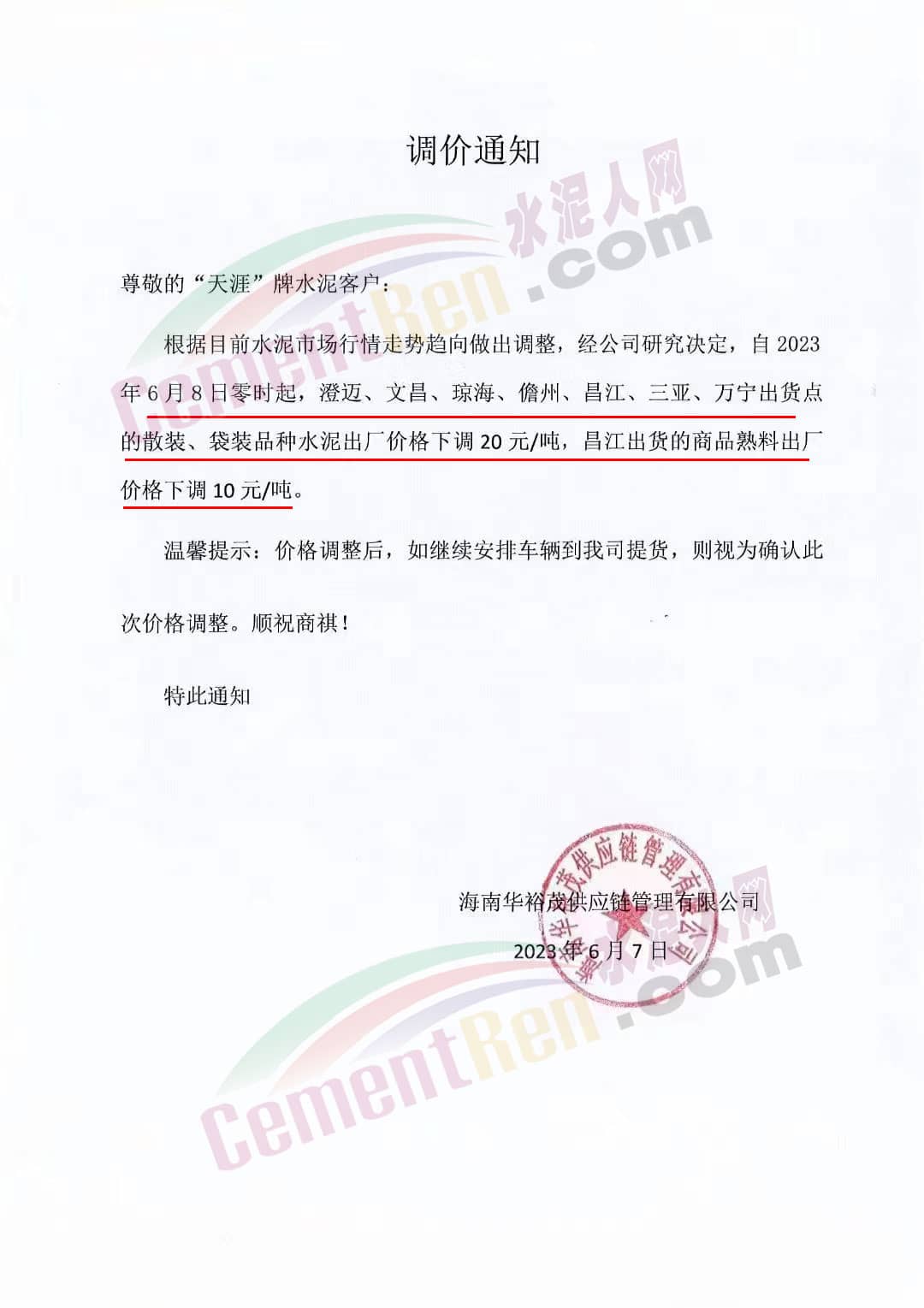 海南华裕茂供应链管理有限公司通知,根据目前水泥市场行情走势趋向做出调整,经公司研究决定,自2023年6月8日零时起,澄迈、文昌、琼海、儋州、昌江、三亚、万宁出货点的散装、袋装品种水泥出厂价格下调20元/吨,昌江出货的商品熟料出厂价格下调10元/吨。