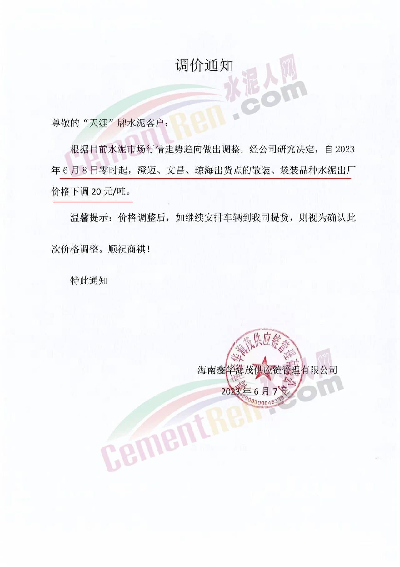 海南鑫华海茂供应链管理有限公司通知根据目前水泥市场行情走势趋向做出调整,经公司研究决定,自2023年6月8日零时起,澄迈、文昌、琼海出货点的散装、袋装品种水泥出厂价格下调20元/吨。