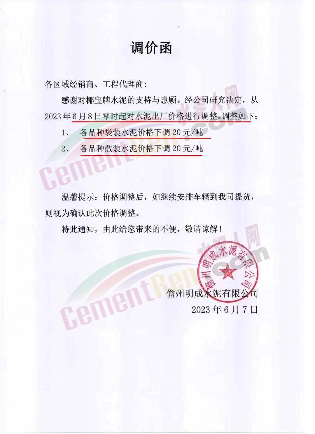 同期儋州明成水泥有限公司发函通知从2023年6月8日零时起对“椰宝”牌水泥出厂价下调20元/吨。